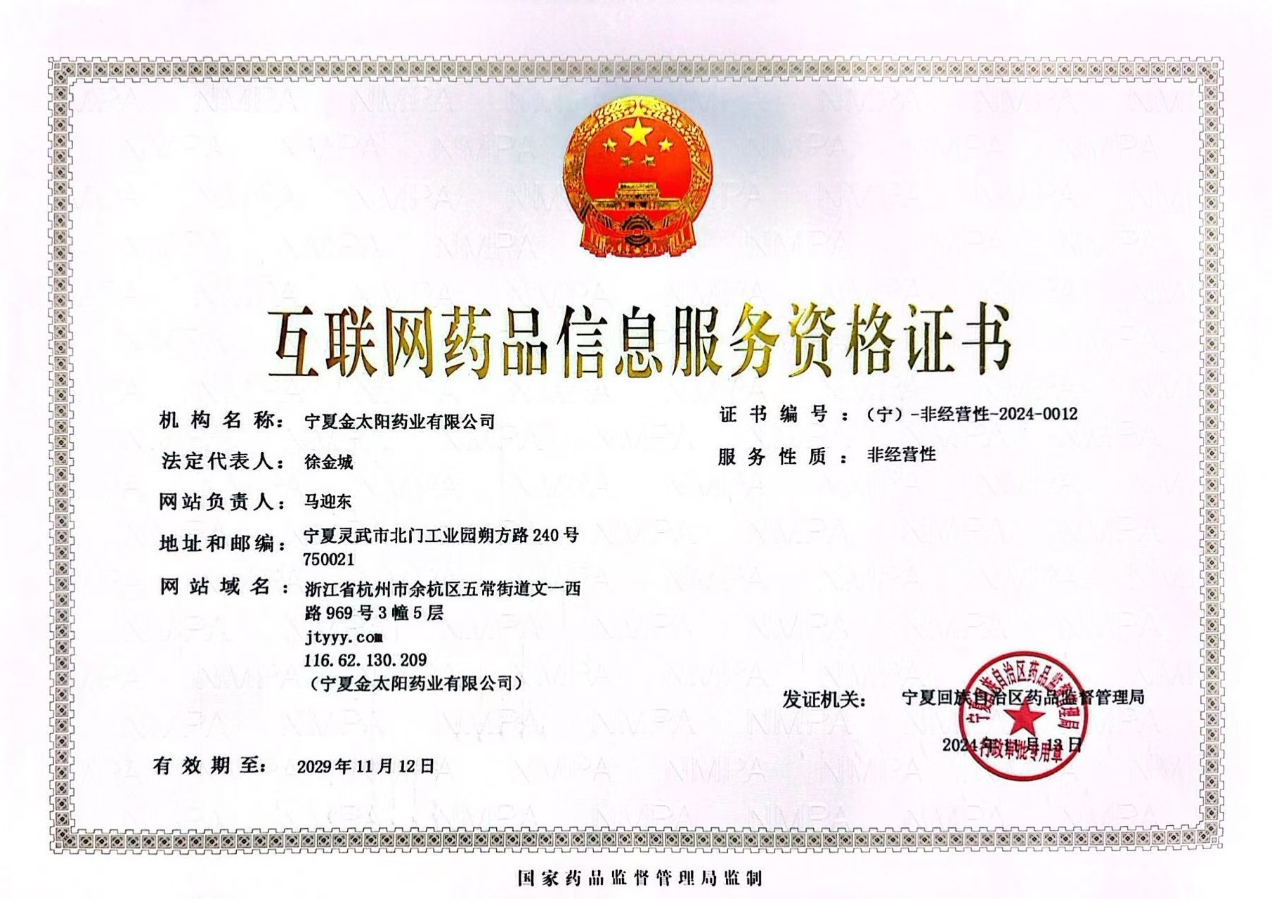 寧夏金太陽(yáng)藥業(yè)有限公司 互聯(lián)網(wǎng)藥品信息服務(wù)資格證書(shū) 證書(shū)編號(hào):(寧)-非經(jīng)營(yíng)性-2019-0005 …