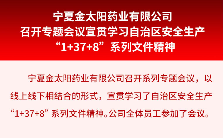 寧夏金太陽(yáng)藥業(yè)有限公司召開(kāi)系列專(zhuān)題會(huì)議,以線(xiàn)上線(xiàn)下相結(jié)合的形式,宣貫學(xué)習(xí)了自治區(qū)安全生產(chǎn)1+37+8系列文件精神。公司全體員工參加了會(huì)議。 會(huì)議宣貫學(xué)習(xí)了: 自治區(qū)黨委 人民政府《…