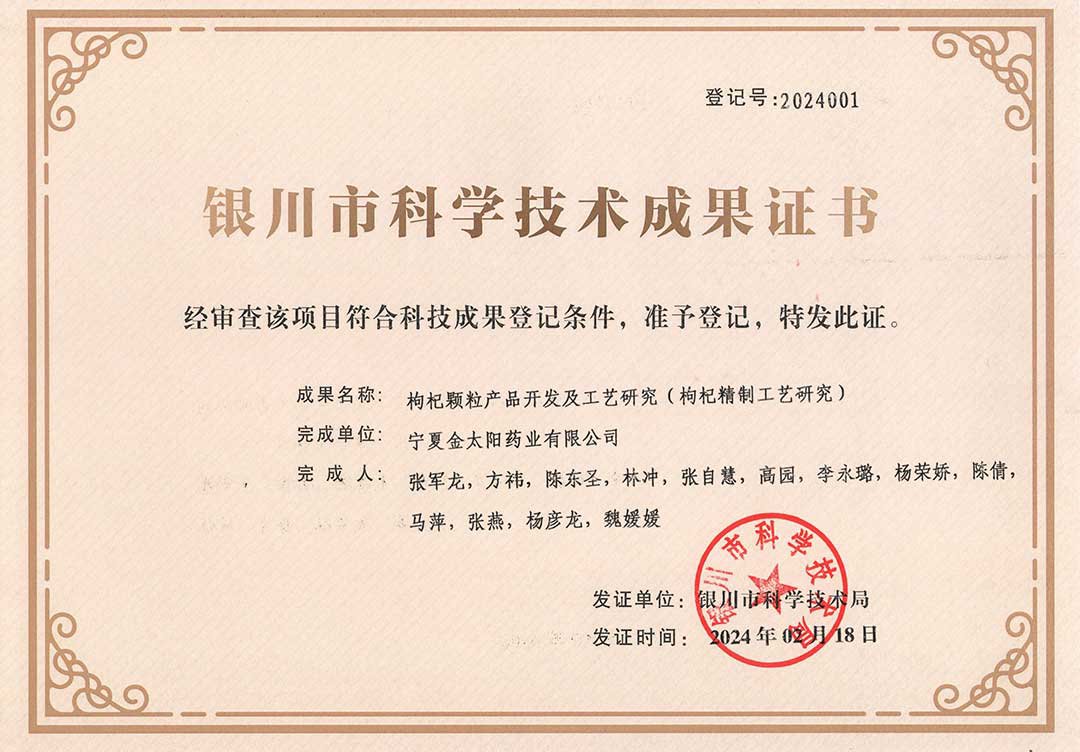 銀川市科學(xué)技術(shù)成果證書(shū)——枸杞顆粒...