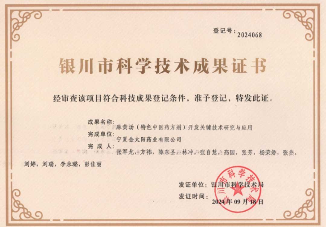 銀川市科學(xué)技術(shù)成果證書(shū)——麻黃湯開(kāi)...